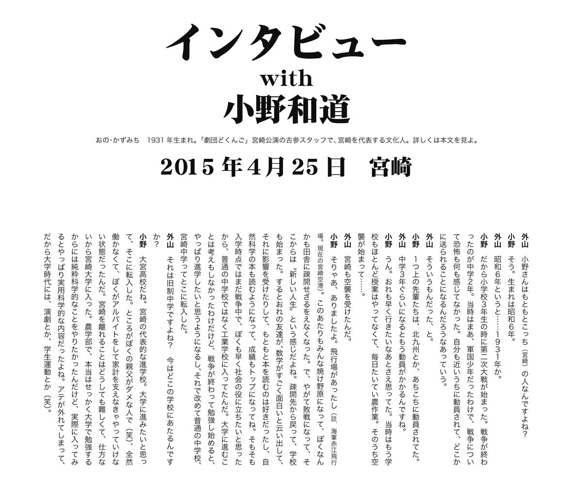 | 上記『サルママ』スタッフたちにも“宮崎の宝”と呼ばれる“小野ジイ”。今年84歳だとはとても思えないパワフルな現役の文化活動家である。図書館職員の傍ら宮崎の文壇・論壇で活躍、70年代から90年代にかけて、「状況劇場」(赤テント)や「天井桟敷」(寺山修司)と並び称されるアングラ演劇の老舗「黒テント」の宮崎公演現地スタッフを務め、また70年代の宮崎のカウンターカルチャーの震源地となったヒッピー・コミューン「夢見るやどかり族」と交流、やがて90年に図書館職員を辞すや“これからはますますやりたい放題やってやる”と活動を加速させ、若者たちがサブカル系ミニコミ誌『サルママ』を立ち上げるといち早くこれを熱狂的に支援し、「黒テント」が勢いを失っていた90年代初頭から今度は「劇団どくんご」宮崎公演の現地スタッフ業務を中心的に担う。Jポップも聴くし若者向けの日本映画も観まくってるし、外山の例の「政見放送」にも全国の「どくんご」関係者の中で最速の反応を寄せてきたと演出家どいの氏も驚愕していた。そんなスーパー老人“小野ジイ”に、来し方を徹底インタビュー。 |