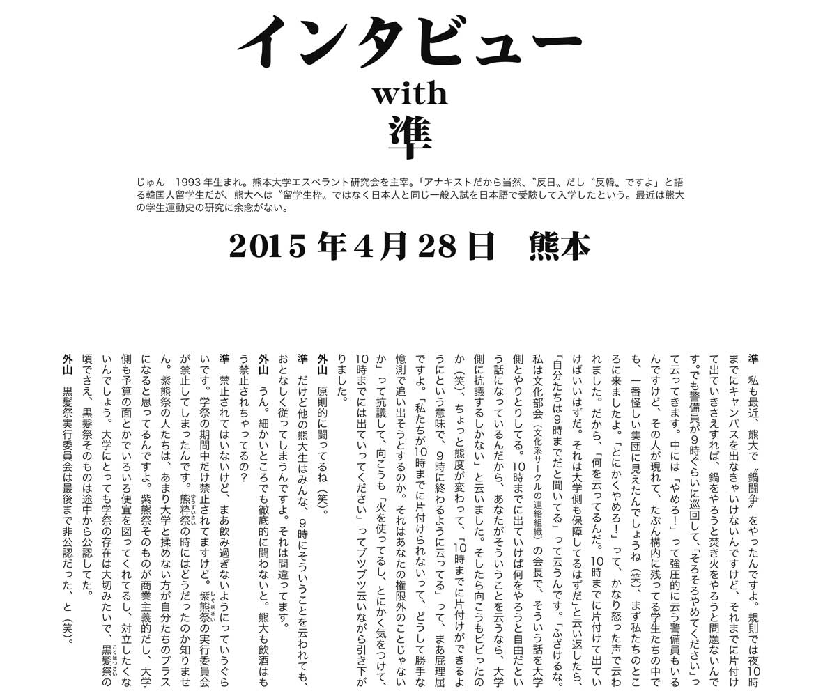 | 韓国人なのに“留学生枠”ではなくフツーに日本語での一般入試を経て熊本大学に入学し、「なんで日本の学生は学生運動をやらないんだー」と日本人だけが理解できないグローバル・スタンダードな義憤に燃えて、だったらオレが何とかする、と“熊大アナキズム研究会”や“熊大エスペラント研究会”を立ち上げ、演劇部や新聞部に飛び込み、文化サークル連合の会長にまでのし上がりながら現在鋭意奮闘中の準君。熊大から学生運動が消滅してしまったのはなぜなのか、と熊大学生運動史の研究にも余念がないようで、とりあえずその“研究成果”を訊いてみた。『デルクイ02』の脇元寛之氏インタビューではまだ未解明だった“90年前後”以外の熊大学生運動史が、真のグローバル人材・準君の手で徐々に明らかにされつつある。 |